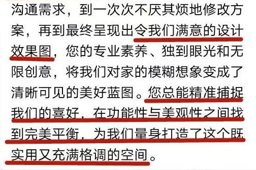 這次有幸與紅牛裝飾公司合作裝修房子,使我深受感動(dòng)!在這三個(gè)月的裝修時(shí)間里,設(shè)計(jì)師顧娟,項(xiàng)目經(jīng)理王志堅(jiān),工程監(jiān)理宋昕,三位老師給我留下了良好而又深刻的印象。設(shè)計(jì)師顧娟工作責(zé)任心強(qiáng),對項(xiàng)目管理嚴(yán)格,以身作則模范帶頭作用好,服務(wù)耐心,熱情,工作標(biāo)準(zhǔn)高。工程監(jiān)理宋昕業(yè)務(wù)能力強(qiáng),作風(fēng)深入扎實(shí),對質(zhì)量要求嚴(yán)格,工作深入扎實(shí),很好地為施工質(zhì)量把了關(guān)。在三位的帶領(lǐng)下,工程隊(duì)的師傅們以高度負(fù)責(zé)的精神保質(zhì)保量高標(biāo)準(zhǔn)地完成了任務(wù)。在這里,我感謝紅牛裝飾公司的領(lǐng)導(dǎo)!更感謝戰(zhàn)斗一線的領(lǐng)導(dǎo)和工人師傅們!